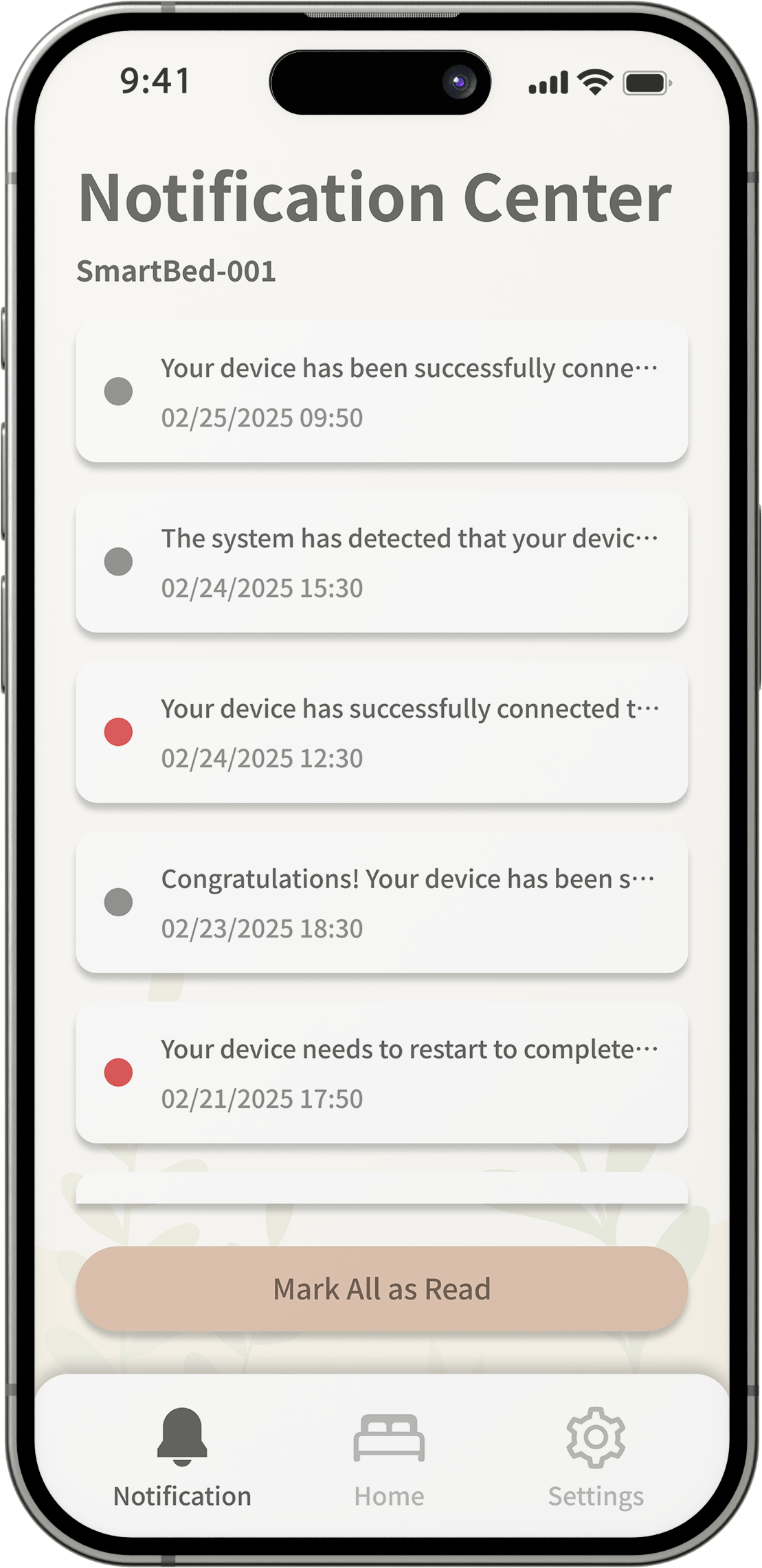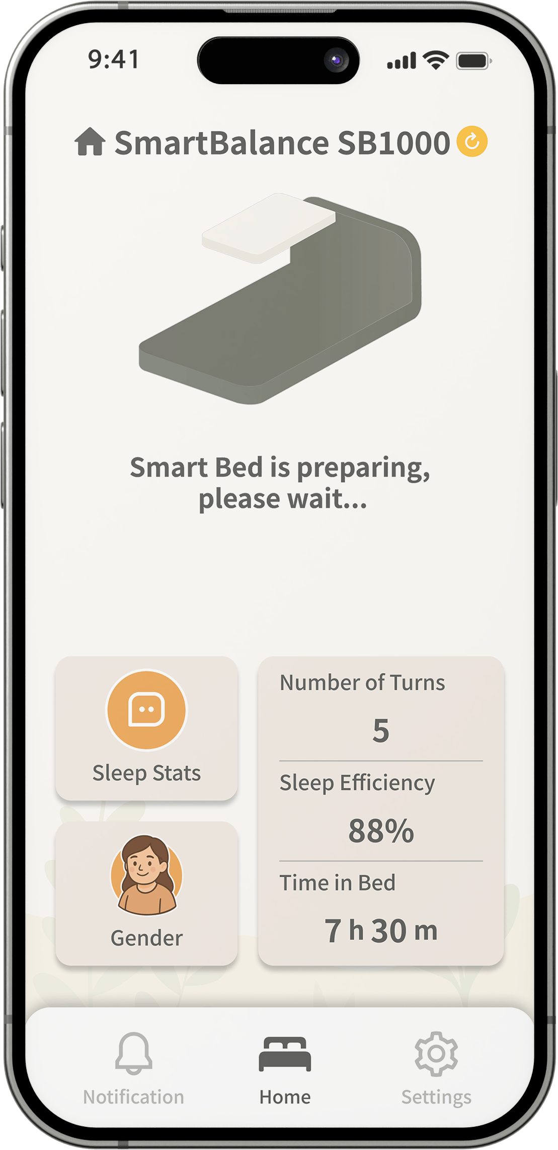 All important reminders related to your Smart Bed appear here.Quickly review the latest updatesand respond when action is required.