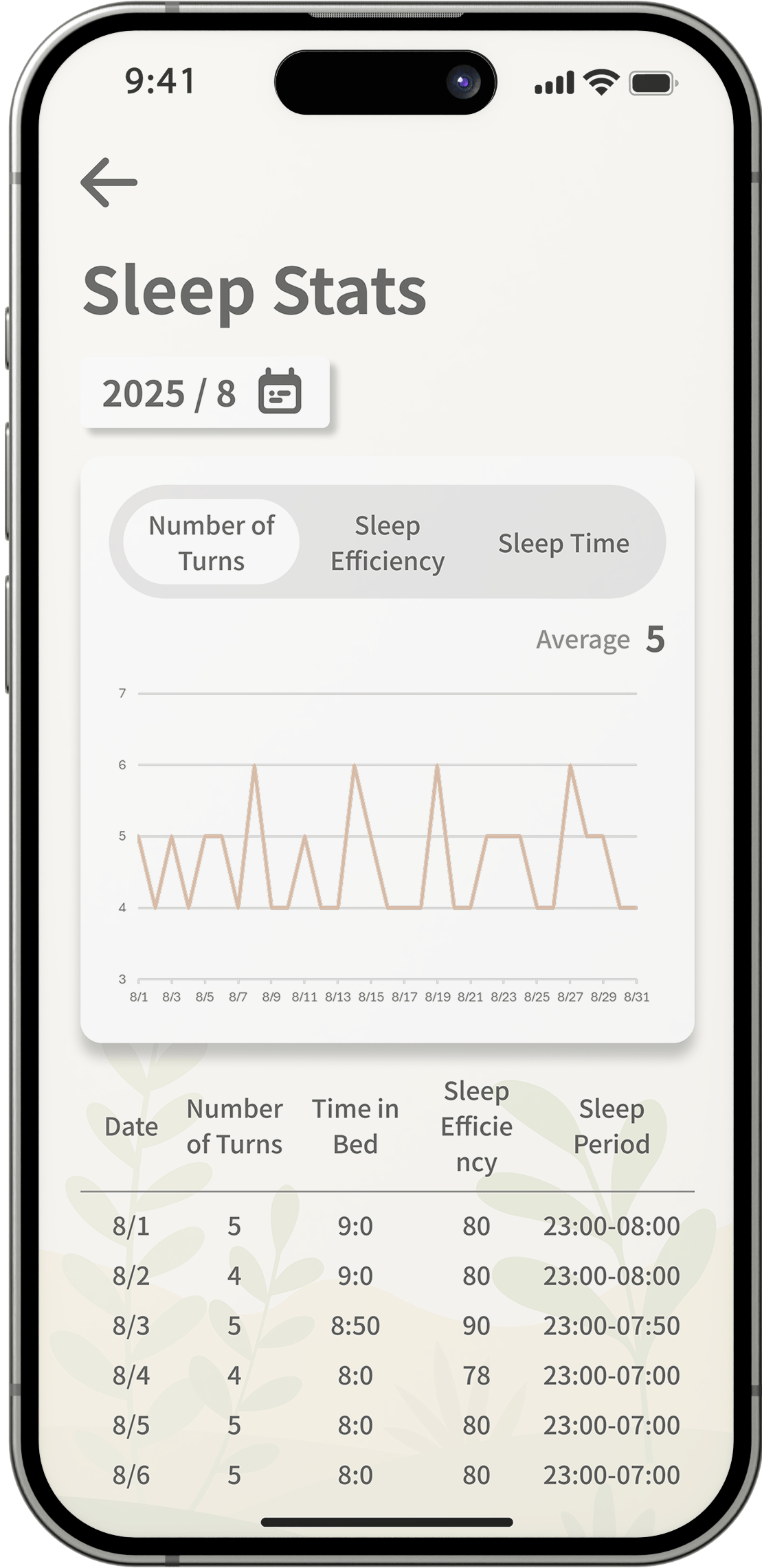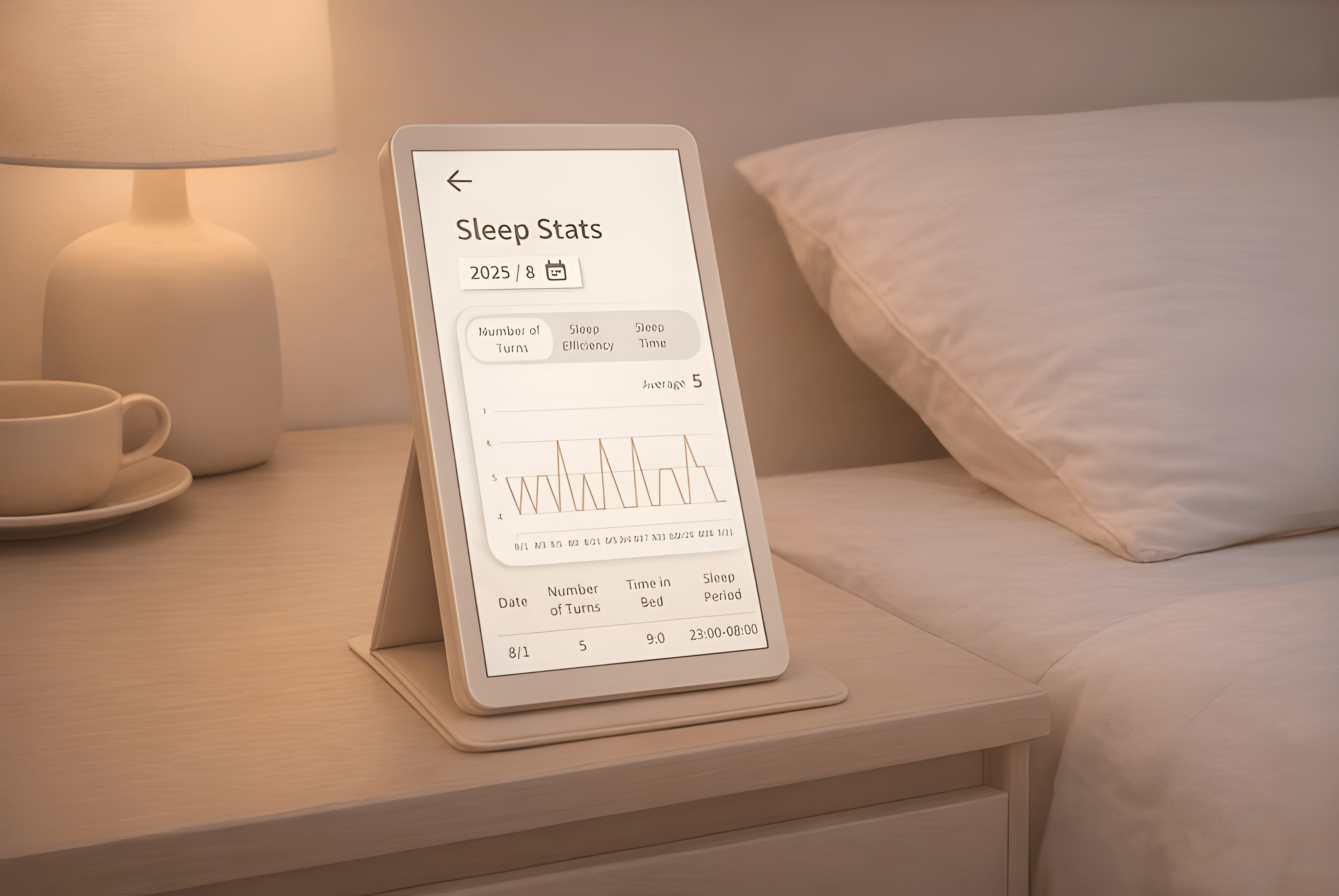 This view summarizes your nightly sleep data,including the number of turns, sleep efficiency, and total sleep time.Charts and daily records help you track patterns over timeand better understand how your body rests each night.